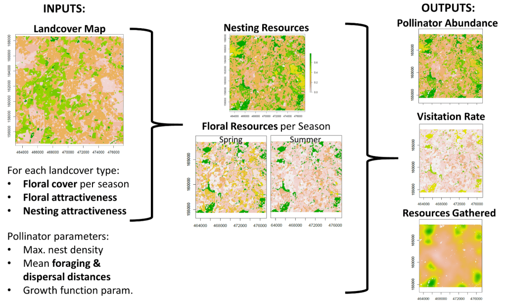 It simulates their central-place foraging around their nests, colony growth and dispersal of new reproductive females. It accounts for seasonality of foraging resources and bee’s preferential use of more rewarding floral resources.