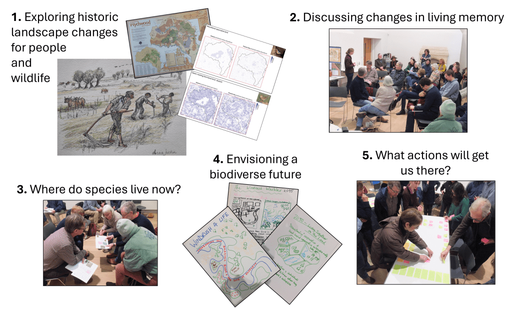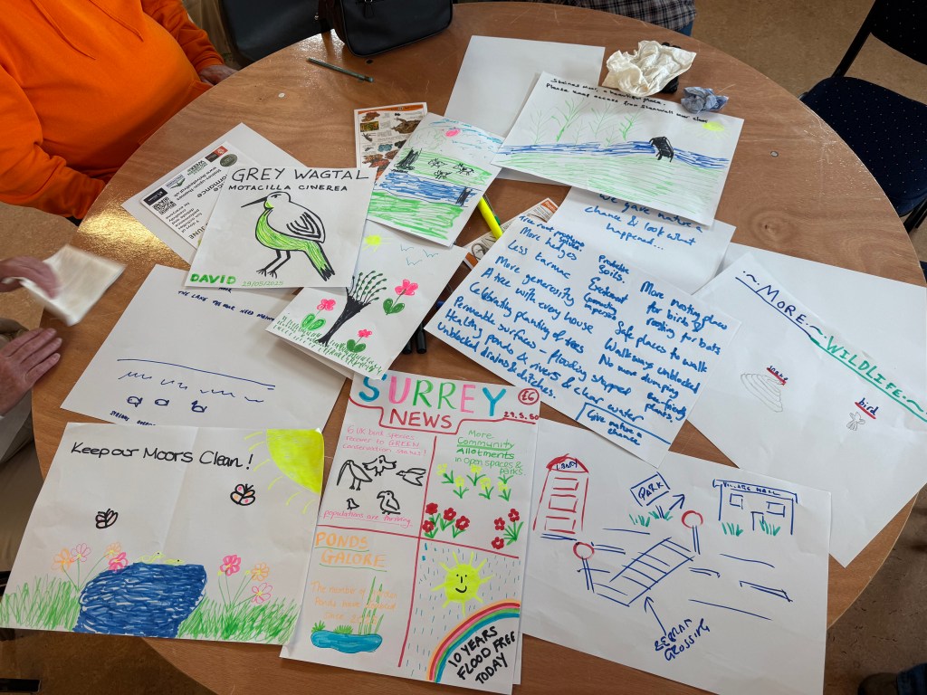 We took a long view of the local landscape changes that had happened since the ice age – both natural and human-driven – and then adapted visioning techniques pioneered by Wyrd Futures to imagine and plan changes to encourage a biodiverse future for the landscape.